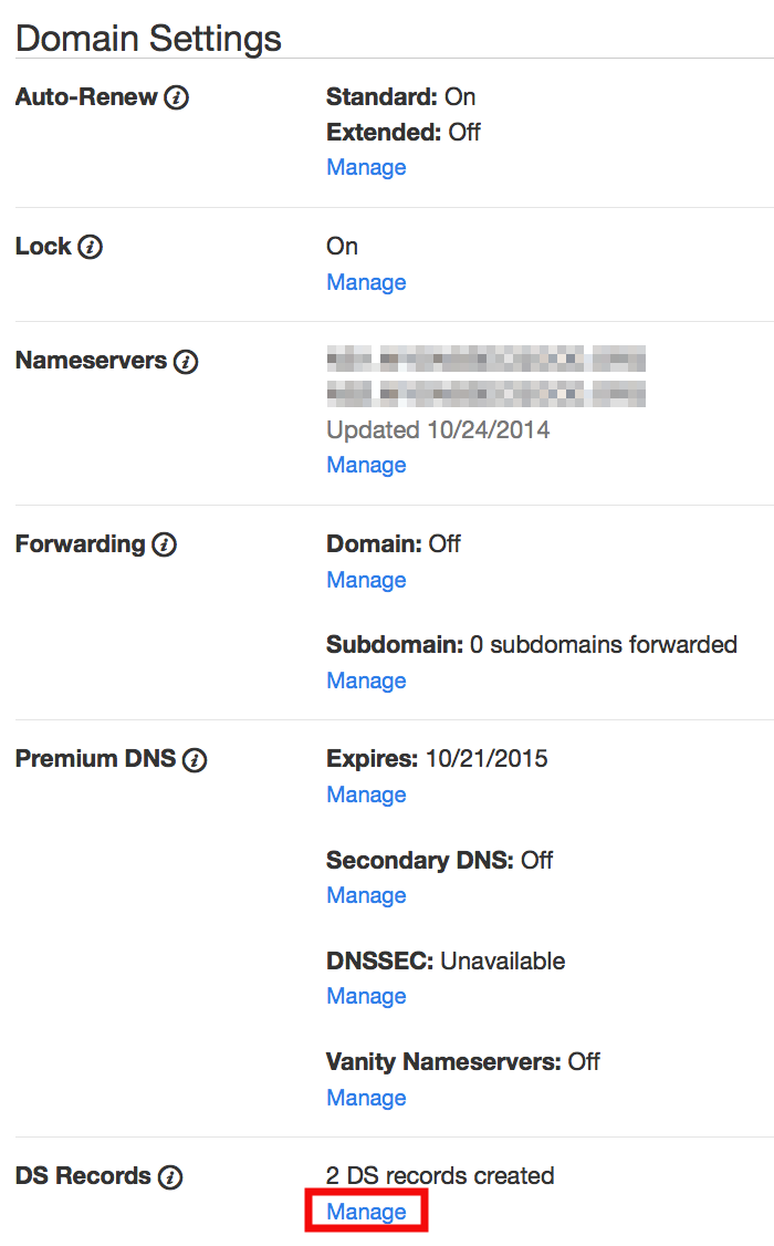 1. Scroll down to the "DS Records" section and click Manage.